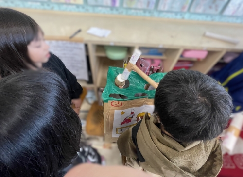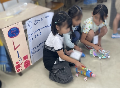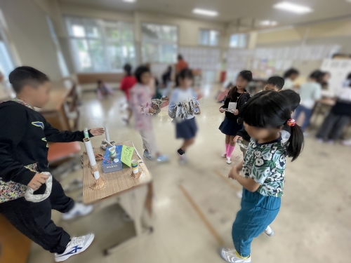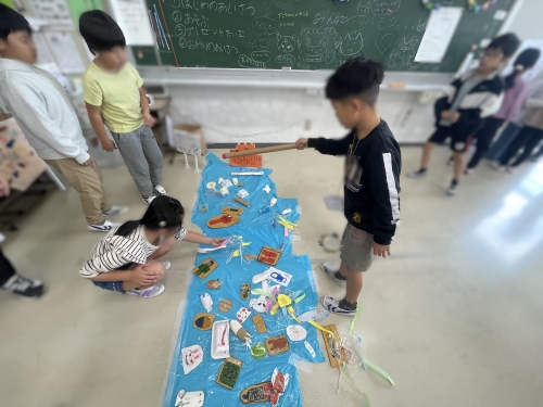 当日、会場にやってきた1年生は、魚釣り、輪投げ、もぐらたたきなど、2年生が趣向を凝らして作った様々なおもちゃやゲームを前に、目を輝かせながら夢中になって遊んでいました。