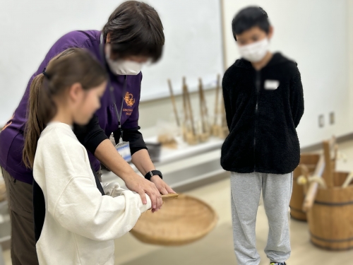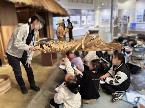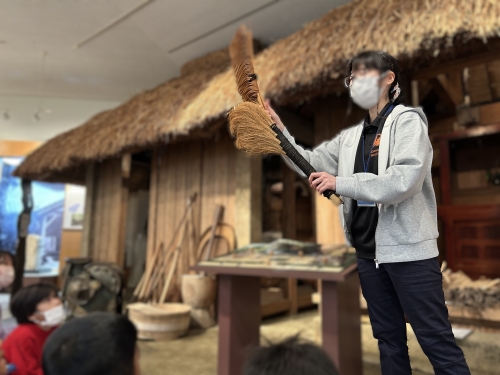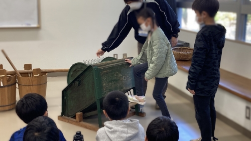 教科書で見たことのある昔の生活の道具などを見学したり、脱穀機(だっこくき)の使い方を実際に体験することもできました。