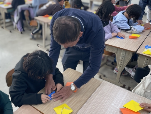 難しい折り方の工程では、先生方が一人ひとりに優しく声をかけてくださり、子どもたちは最後まで集中力を切らすことなく、自分だけの「こま」を完成させることができました。