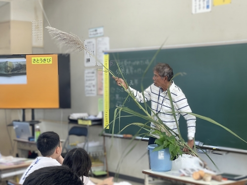 実際に育てたサツマイモやサトウキビなど、たくさんの実物を持ってきてくださり、子ども達は実物に触れながら学習を進めました。
