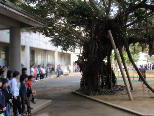 本校の中庭にどっしりと構える「がじゅまるの木」。実はこの木、学校が開校するずっと前からこの地に根を下ろし、何世代にもわたって地域や子どもたちを見守り続けてきました。