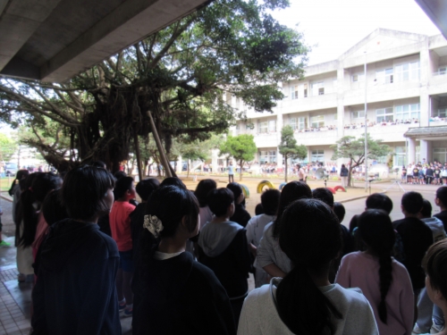 本日、青空の下、中庭にて「がじゅまる音楽朝会」を開催しました。